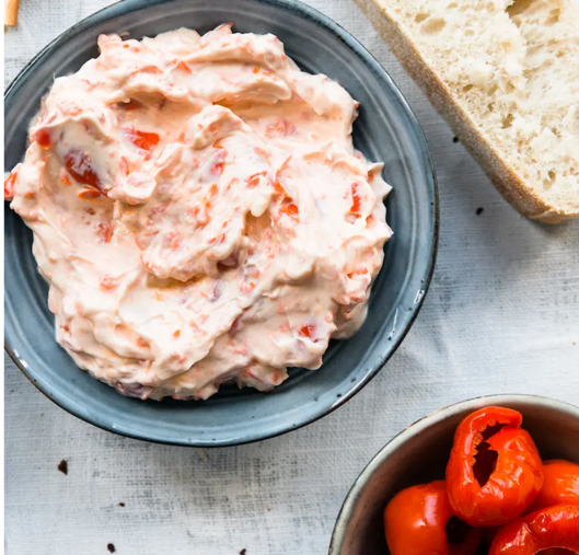 Laat de geroosterde paprika’s uitlekken. Maal de paprika’s fijn samen met de knoflook en de bieslook in een keukenmachine. Voeg de roomkaas en de droge kruiden en mix het geheel nog even kort door elkaar. Breng op smaak met zout.